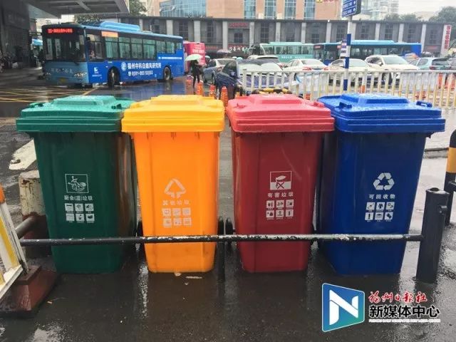 福州汽車北站內(nèi)的四色分類垃圾桶已投放到位。(資料圖)