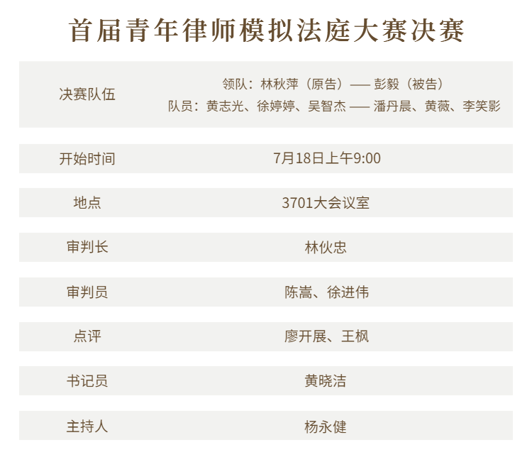 2020年7月4日,上海錦天城(福州)律師事務(wù)所首屆青年律師模擬法庭大賽展開(kāi)半決賽的爭(zhēng)奪,從初賽中脫穎而出的四支隊(duì)伍強(qiáng)強(qiáng)相遇,為我們帶來(lái)了精彩的庭審交鋒。一起隨著小編來(lái)感受庭審內(nèi)外的魅力吧!