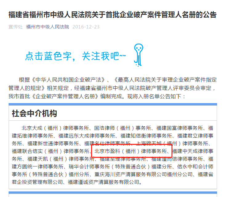 7月14日,經(jīng)福建省南平市中級人民法院破產(chǎn)管理人評審委員會審定,南平市中級人民法院公布《關(guān)于第二批企業(yè)破產(chǎn)案件管理人名冊的公示》,北京市盈科(福州)律師事務(wù)所憑借優(yōu)良成績、專業(yè)素養(yǎng),成功入冊。