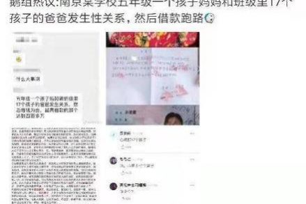 福州律師蔡思斌原創(chuàng)–南京一小學(xué)孩子媽媽和班級里17個家長發(fā)生關(guān)系并借款跑路!……真?zhèn)挝?/a> 福州律師資訊發(fā)布者 福州律師網(wǎng)2019年9月6日9月5日微博@娛樂追擊令爆料稱南京某學(xué)校五年級一個孩子媽媽和班級里17個孩子的爸爸發(fā)生性關(guān)系,然后借款跑路!消息一出,震詳情
