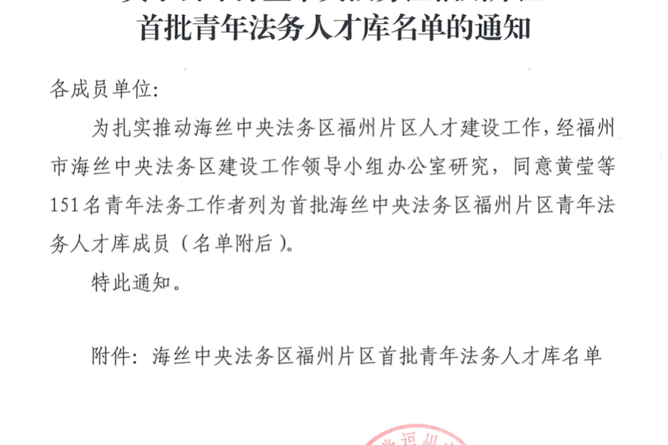 福州律師資訊:海絲中央法務區(qū)福州片區(qū)首批青年法務人才庫名單正式發(fā)布! 福州律師資訊發(fā)布者 福州律師網(wǎng)2024年4月28日為扎實推動海絲中央法務區(qū)福州片區(qū)人才建設工作,經(jīng)福州市海絲中央法務區(qū)建設工作領導小組辦公室研究,同意黃瑩等151名青年法詳情